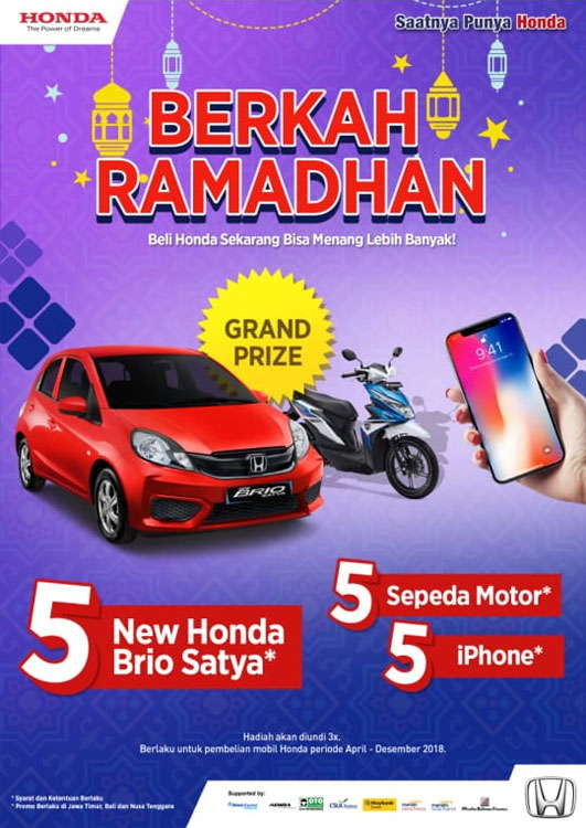 Ayo ikut program "Berkah Ramadhan" dengan membeli mobil Honda tipe apa saja selama periode April - Desember 2018 dan dapatkan hadiah berupa 5 unit New Honda Brio Satya, 5 unit Sepeda Motor dan 5 unit gadget. Pengundian akan dilakukan 3x yaitu pada bulan Juli 2018, Oktober 2018 dan Januari 2019.